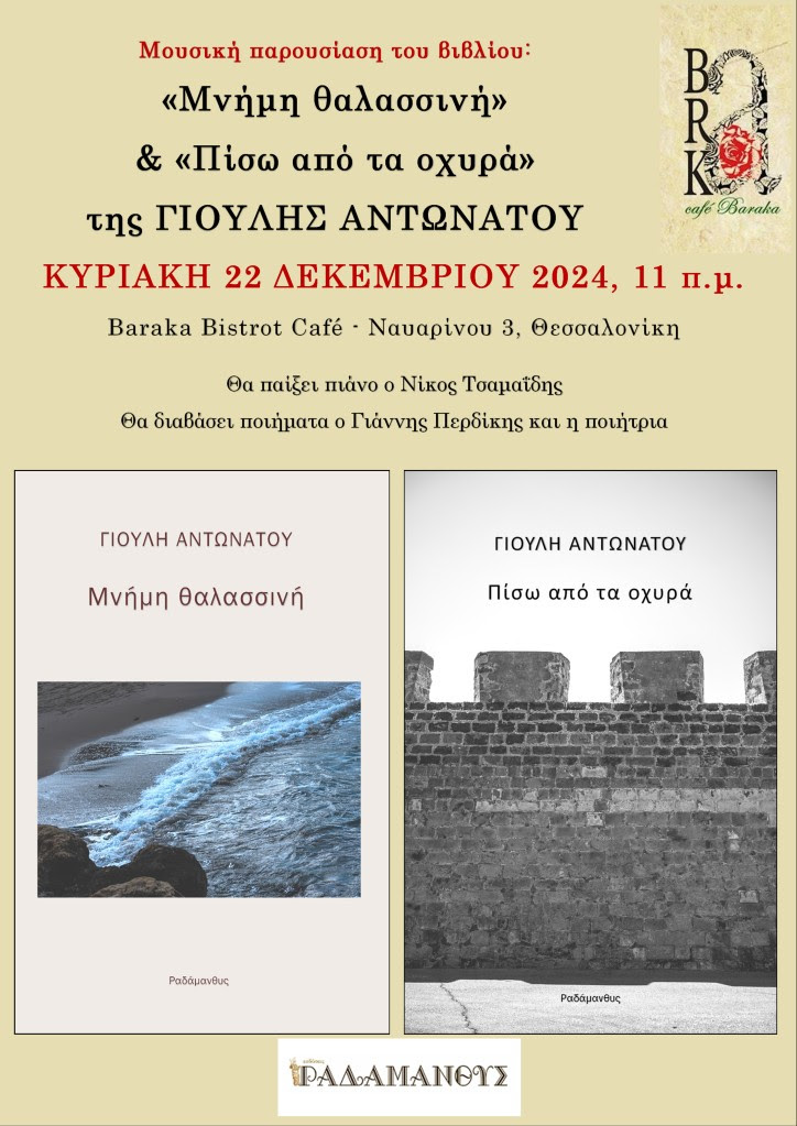 Οι Εκδόσεις Ραδάμανθυς σας προσκαλούν στην παρουσίαση των ποιητικών συλλογών της Γιούλης Αντωνάτου, με τίτλο «Μνήμη θαλασσινή» και «Πίσω από τα οχυρά», την ΚΥΡΙΑΚΗ 22 ΔΕΚΕΜΒΡΙΟΥ 2024, 11 π.μ., στο Baraka Bistrot Café – Ναυαρίνου 3, Θεσσαλονίκη. Θα παίξει πιάνο ο Νίκος Τσαμαΐδης. Θα διαβάσει ποιήματα ο Γιάννης Περδίκης και η ποιήτρια.