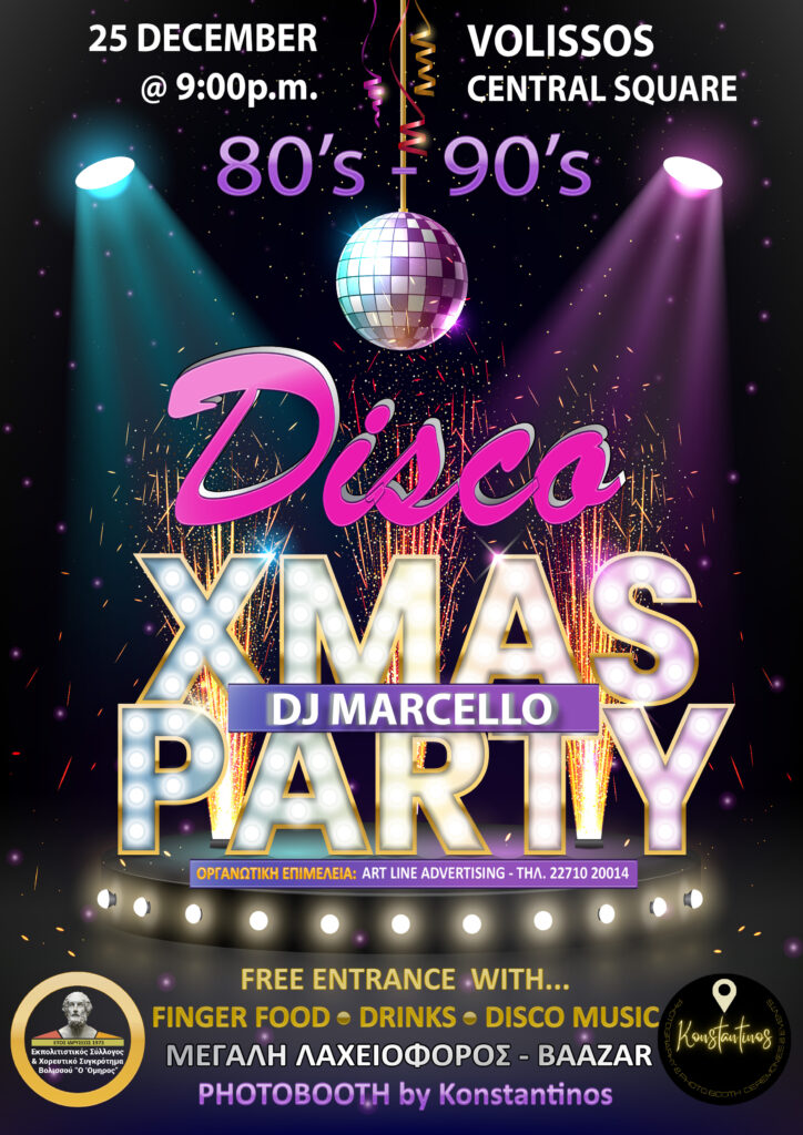Ενα ανεπανάλυπτο Christmas Disco Party σας περιμένει την ημέρα των Χριστουγέννων στην κεντρική πλατεία -Χριστός- στην Βολισσό με μουσική 80’ς-90’ςαπό τα μαγικά χέρια του γνωστού και αγαπημένουDJ MARCELLO. Την εκδήλωση διοργανώνειο ΕΚΠΟΛΙΤΙΣΤΙΚΟΣ ΣΥΛΛΟΓΟΣ& ΧΟΡΕΥΤΙΚΟ ΣΥΓΚΡΟΤΗΜΑ ΒΟΛΙΣΣΟΥ “Ο Ομηρός”με την οργανωτική επιμέλειατης ART LINE ADVERTISING. ΔΩΡΕΑΝ ΕΙΣΟΔΟΣ ΓΙΑ ΟΛΟΥΣ με …FINGER FOOD – ΚΕΡΑΣΜΑΤΑ – ΠΟΤΑ Μεγάλη Λαχειοφόρος και Baazar από τον Σύλλογοκαθώς και το γνωστό και αγαπημένοPhoto Booth by Konstantinosγια να φωτογραφηθείτε και να κρατήσετετις αναμνησεις από την επίσκεψη σας στο χωριό μας. Δηλώστε την συμμετοχή στο EVENT που έχει δημιουργηθείγια τον καλύτερο προγραμματισμό μας.https://www.facebook.com/events/941557654154985/?acontext=%7B%22event_action_history%22%3A[%7B%22mechanism%22%3A%22attachment%22%2C%22surface%22%3A%22newsfeed%22%7D]%2C%22ref_notif_type%22%3Anull%7DΘα χαρούμε να σας έχουμε όλους κοντά μας.Τηλ. για πληροφορίες (ART LINE ADVERTISING) 6945215236.