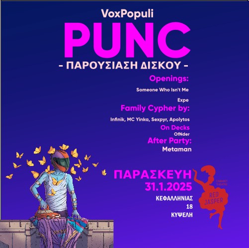 Στο Red Jasper Cabaret Theatre, ο VoxPopuli θα παρουσιάσει το νέο του album “PUNC”, ένα νέο αθηναϊκό νουάρ μυθιστόρημα σαν αυτά του Maurice Attia χωρίς όμως αστυνομικό για πρωταγωνιστή. Πρωταγωνιστές είναι οι λεγόμενες “πλέμπες”, οι άνθρωποι δηλαδή που αναγκάζονται σε εξαντλητικές ώρες δουλειάς για να επιβιώσουν και στον ελάχιστο ελεύθερο τους χρόνο κάνουν τέχνη.